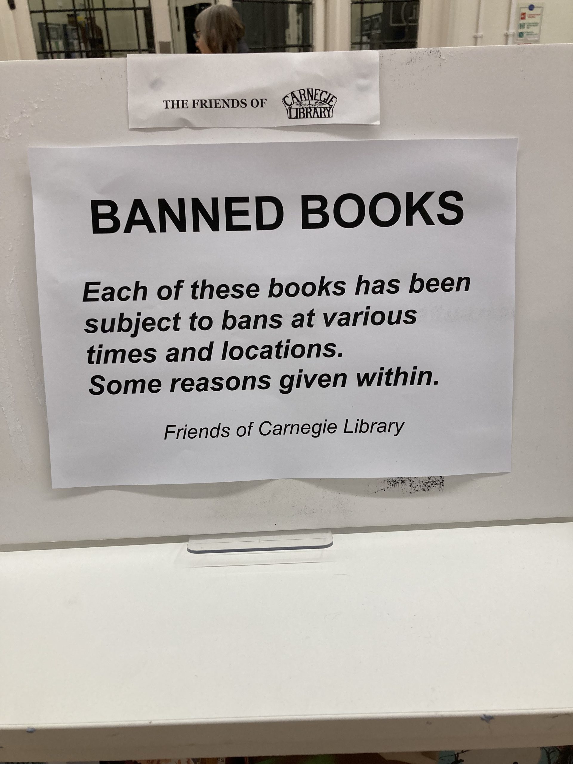 The Friends have put together an exhibit of books which have been banned at various times and in various places. Copies of the books have been gathered from the library's collection and inside each one of them is a note with background on when and where they have been banned and the sometimes strange reasons given for doing so. This exhibit was inspired by the Banned Books Project @Carnegie Mellon University and the American Library Association's Banned Book Week (just passed).